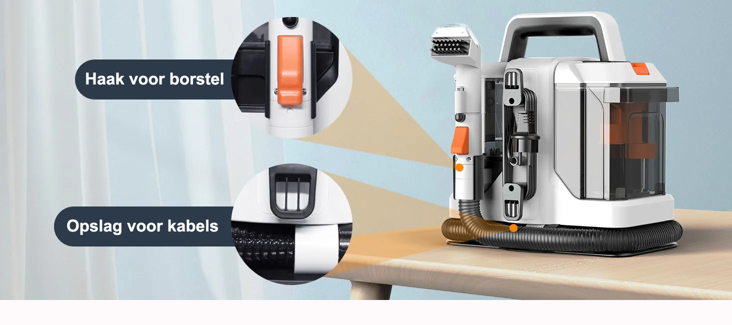 Dubbel tanksysteem met afneembaar ontwerp. De vuilwatertank kan na gebruik eenvoudig worden verwijderd voor een grondige reiniging. Dit voorkomt effectief de ophoping van vuil en onaangename geuren en houdt het interieur van het apparaat schoon en hygiënisch. Het afneembare dubbel tanksysteem verhoogt niet alleen het gebruiksgemak, maar verlengt ook de levensduur van het apparaat en zorgt bij elk gebruik voor een optimaal reinigingsresultaat.